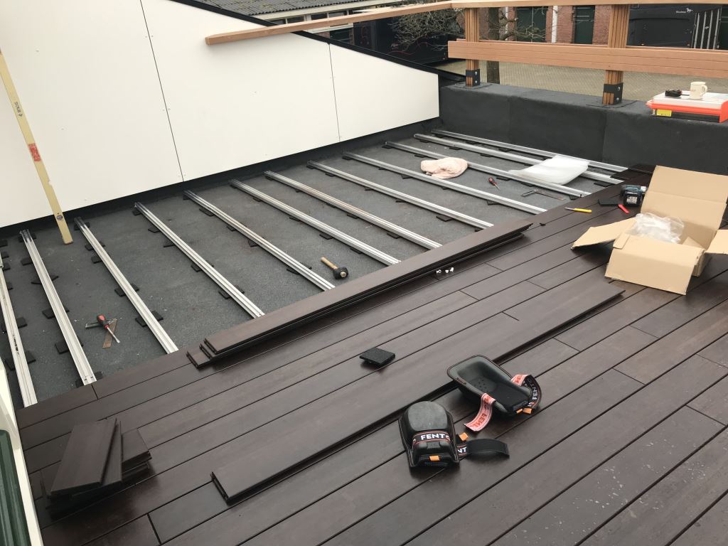 De terrasdelen worden bevestigd met behulp van een aluminium onderconstructie die je aan de bovenkant niet ziet! Revolutionair en gepatenteerd buitenparket systeem!