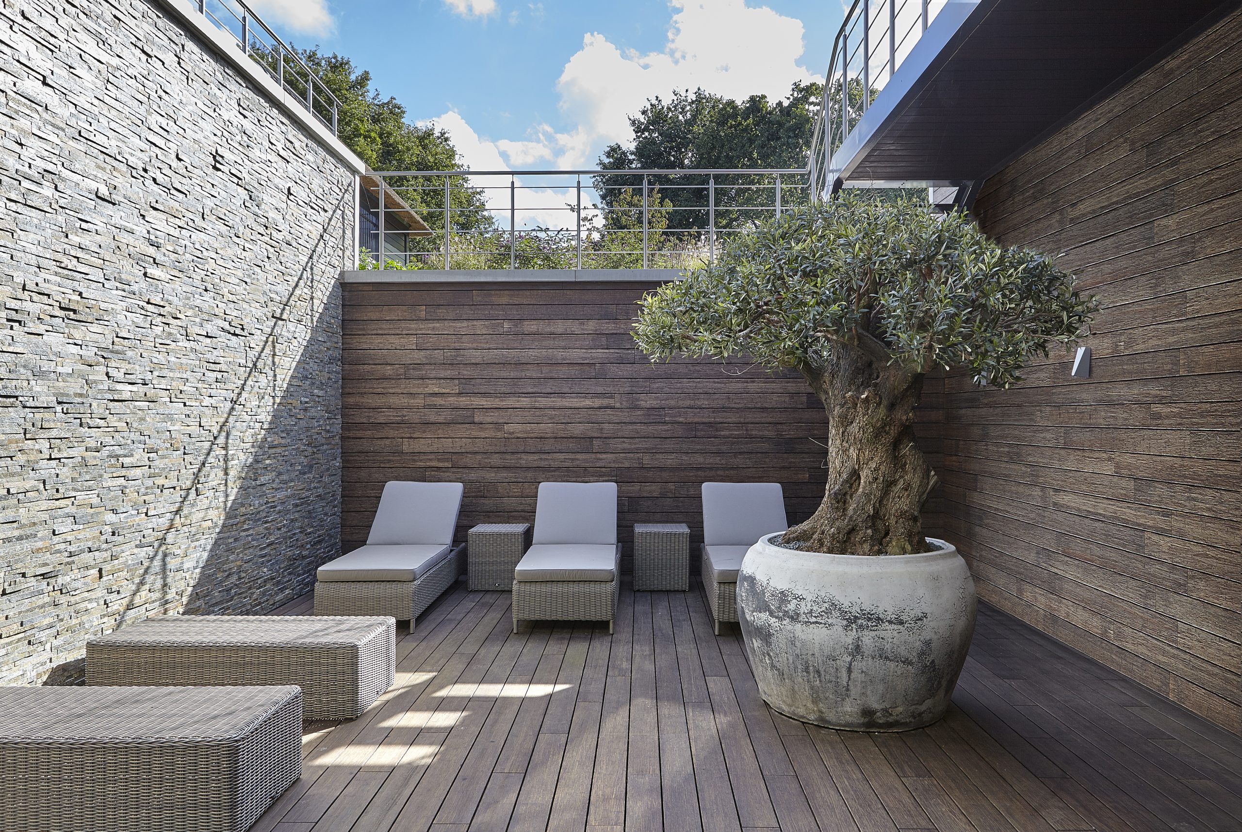 Voor de installatie van gevelbekleding gebruiken wij dezelfde gepatenteerde systemen als die we voor een prachtig terras gebruiken. Op die manier is het mogelijk om het hout wat op het terras gebruikt wordt, terug te laten komen op de gevel of wand. Zo creëert u één geheel van het buitenaanzicht van de woning.